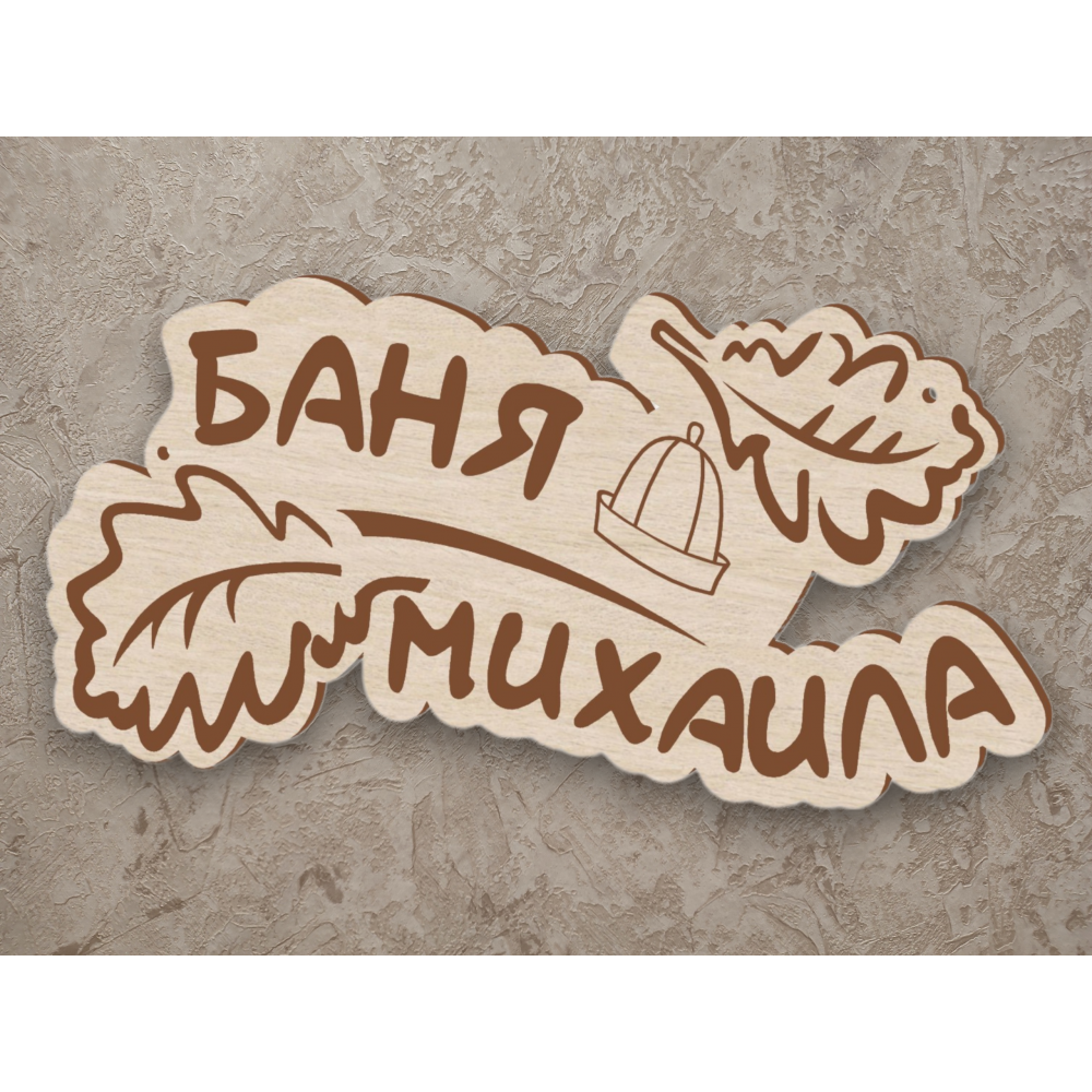 Именная табличка из фанеры для бани с изображениями банных предметов.